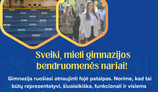 Sveiki, mieli gimnazijos bendruomenės nariai! Gimnazija ruošiasi atnaujinti fojė patalpas. Norime, kad tai būtų reprezentatyvi,